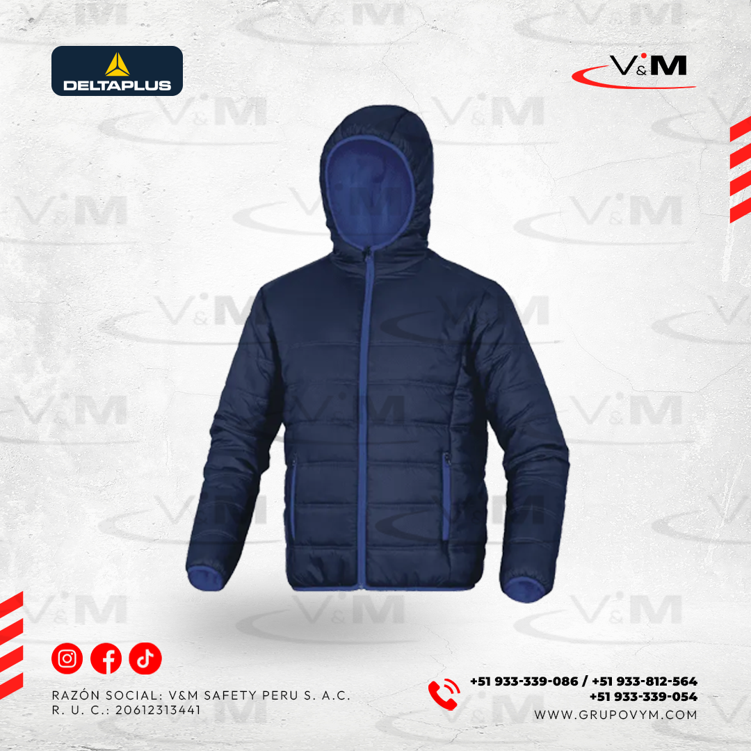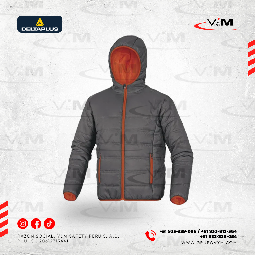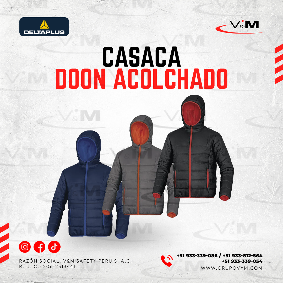La casaca DOON de Delta Plus ofrece protección térmica gracias a su acolchado de poliéster y forro de tafetán. Ideal para reformas, artesanos y almacenamiento. Disponible en varios colores y tallas (S a XL), con capucha fija y diseño resistente.