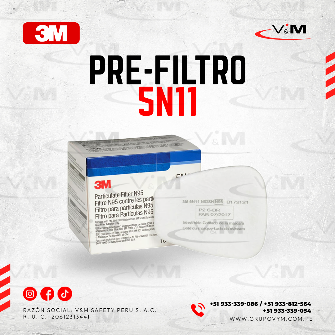 El pre-filtro 3M 5N11 N95 ofrece protección contra partículas sólidas y líquidas no oleosas. Se utiliza junto con cartuchos 3M y el retenedor 501. Ideal para aplicaciones como lijado, esmerilado y corte.